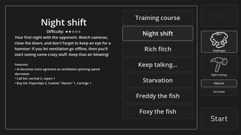 Ты получил работу у самого Кошака! Ночная охрана, диспетчер звонков, инвентаризация, проверка оборудования, забота о хомячке, что только нет - все на твоих (теперь очень занятых) плечах. Время не важно, когда закончишь тогда и уходишь, однако овертайм, конечно же, приветствуется. Что может пойти не так?